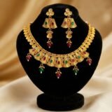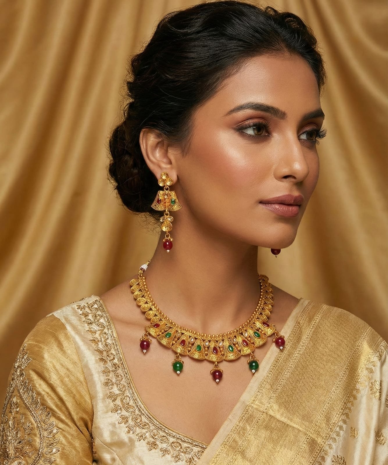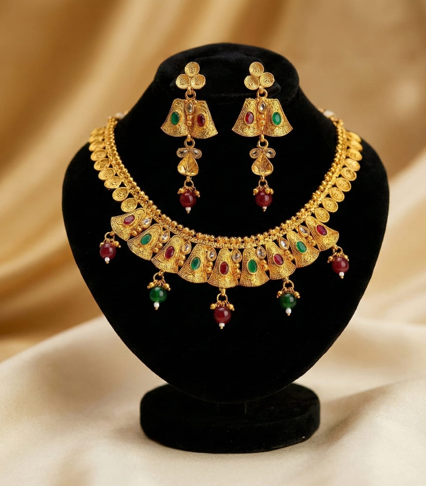 Elevate your festive or special occasion look with our Golden Necklace & Earrings Set, a stunning combination of elegance and craftsmanship. The necklace features exquisite gold-toned metalwork adorned with vibrant red and green stones, creating a rich, traditional aesthetic that complements any outfit beautifully.