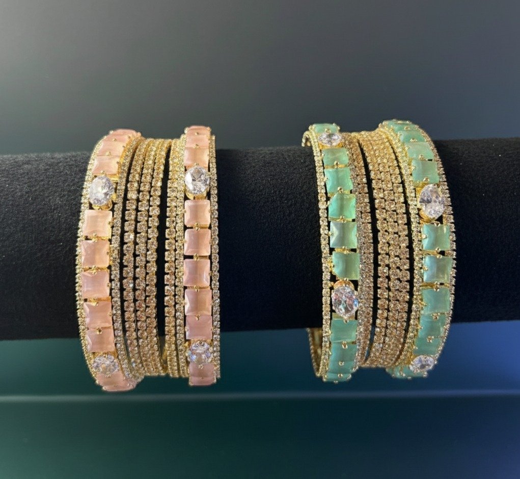 Elevate your bridal or festive look with our stunning Dual-Tone Bangle Set. Featuring brilliant, diamond-cut stones and elegant pastel enamel work.