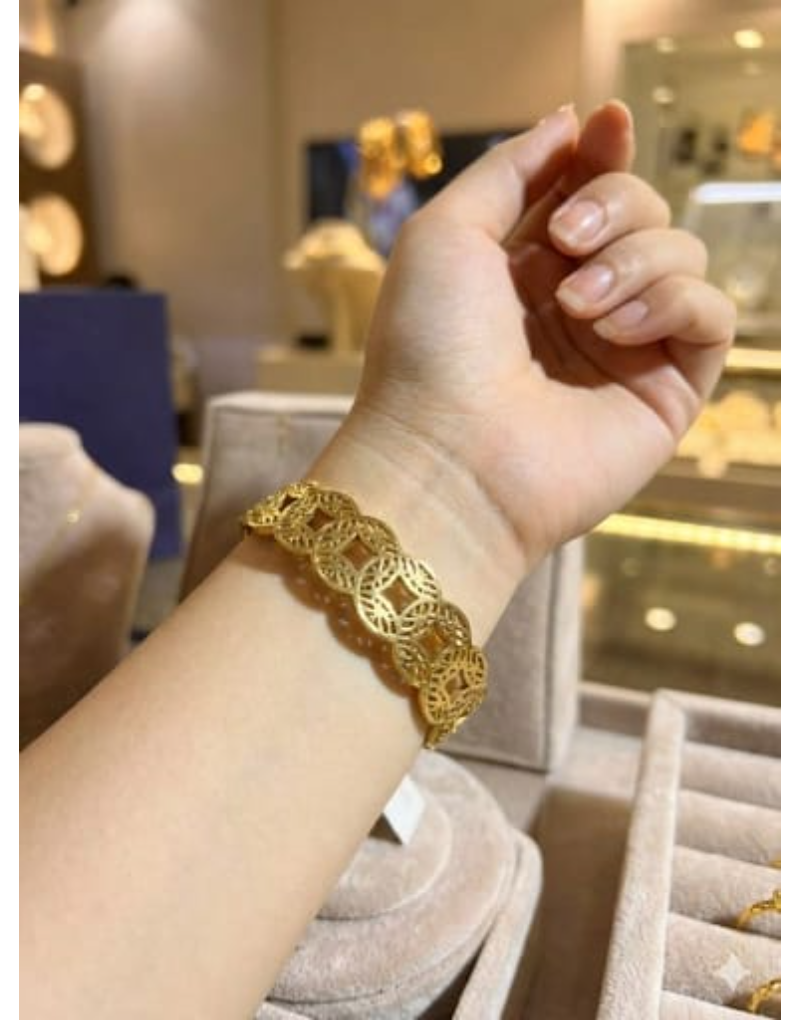 At the heart of the design lies a striking interlocking coin pattern, a symbol of auspicious charm and classic refinement. This motif infuses the cuff with subtle cultural significance while maintaining an eye-catching modern aesthetic. Perfect for formal and casual occasions, this intricate design allows the bangle to stand out as a piece of wearable art, making a statement every time you don it.
