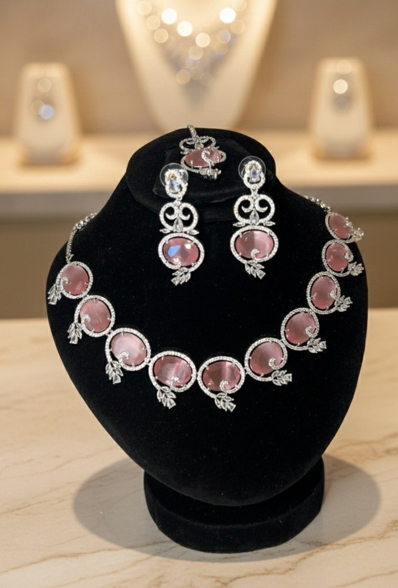 Introducing the Pink Petal Jewelry Set, a stunning new arrival designed to add elegance and charm to any look. Featuring delicate pink stones arranged in a graceful floral pattern, this set captures the essence of femininity and sophistication. The intricate craftsmanship and fine detailing make it a true statement piece that enhances both traditional and contemporary outfits.