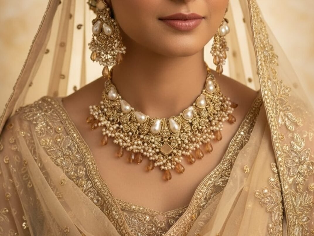 This set is crafted using a high-quality Metallic Alloy and features a Premium Antique Polish that ensures it maintains its shine and colour for a long time. Instead of natural pearls, we have used beautiful Iridescent Shell-Style Stones that reflect light in various hues, providing a rich, natural feel.